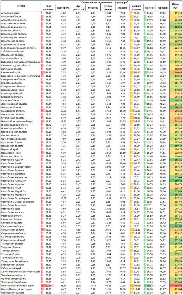 Дороже всего «Оливье» в этом году обойдется жителям Чукотки: на салат придется выложить 457 рублей 44 копейки. На Камчатке салат обойдется в 306,5 рублей. На третьем месте с конца – Магаданская область – 298 рублей 28 копеек.
