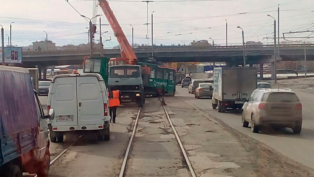 В Челябинске на оживленной магистрали сошел с рельсов трамвай.