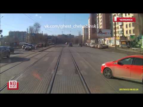 Водитель челябинского трамвая снял на видео, как под его вагон выруливает иномарка.