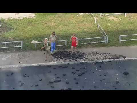 На записи видно, как трое мальчишек с удовольствием раскидывают застывший на пешеходной дорожке асфальт по всему двору.