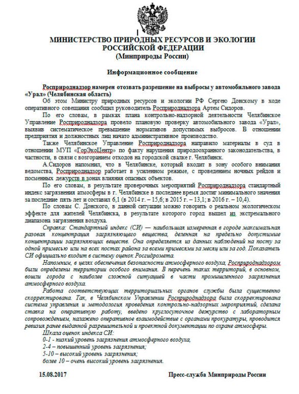 На АЗ «Урал» назвали эту информацию недостоверной: «Управление Росприроднадзора по Челябинской области подтвердило официально, приказом №672 от 4 августа 2017 года, возобновление разрешения для автозавода «Урал» на выбросы. Предприятие провело технические мероприятия по достижению установленных нормативов. После этого был проведен лабораторный контроль на источниках выбросов, по результатам которого установлено отсутствие превышений и направлено официальное письмо от АЗ «Урал» в адрес челябинского управления Росприроднадзора, – завили в пресс-службе предприятия. – Управление выпустило соответствующий приказ, подтверждающий устранение нарушения. Нарушение было выявлено однократно, систематических превышений допустимых выбросов предприятие не допускало».