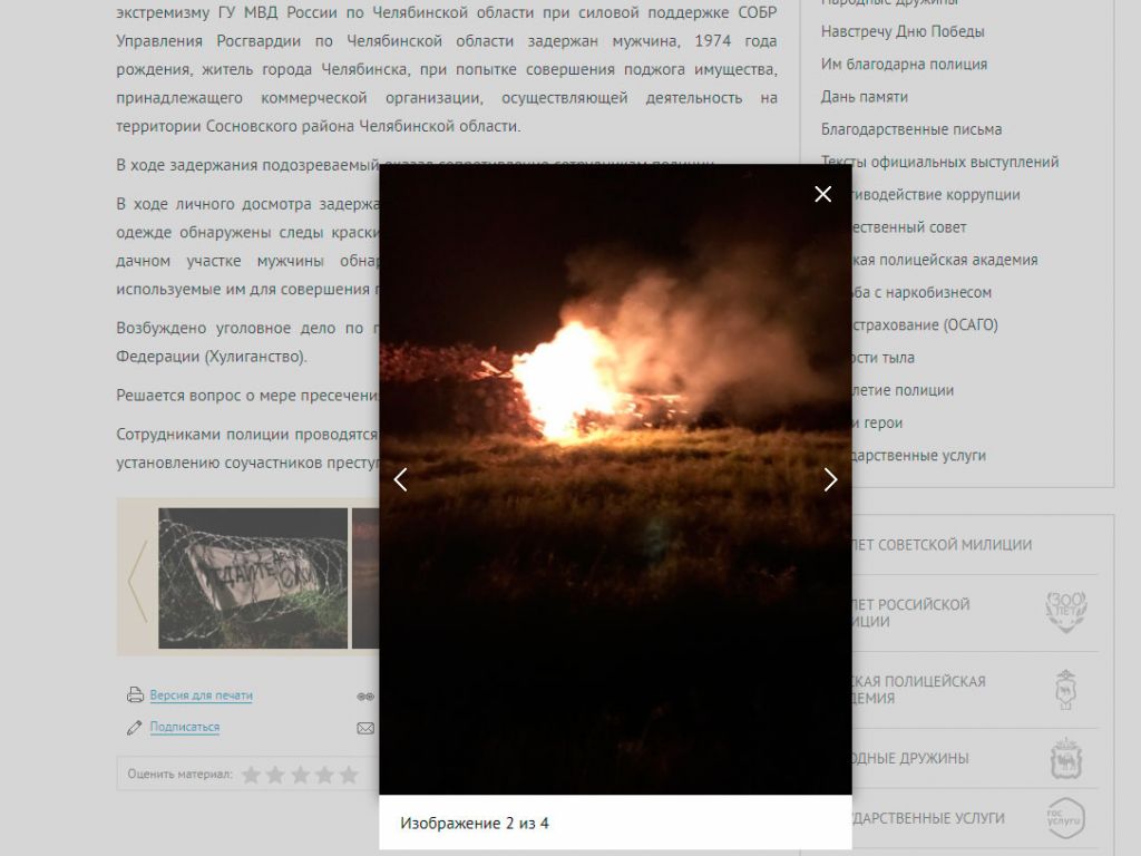Обратите внимание, что Улановский не указывает причиненный ущерб, лишь отмечая, что он мог бы быть крупным. А на сайте ГУ МВД РФ по Челябинской области есть фотография того самого ночного пожара – площадь возгорания небольшая и никакой техники в кадре, как и пытающихся тушить очаг. Получается, что те, кто сделал эти фотографии – сотрудники полиции или охраны территории – стояли и спокойно наблюдали, как разгорается огонь, предусмотрительно его фотографируя?