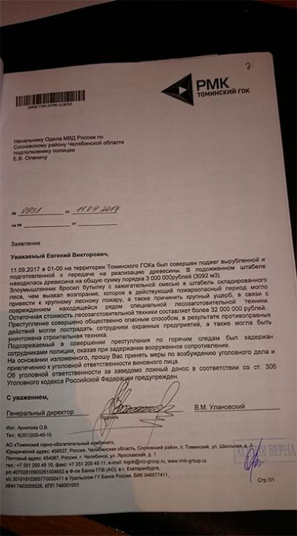 Кроме того, экологические активисты опубликовали скан письма генерального директора АО «Томинский ГОК» Валерия Улановского на имя начальника ОМВД по Сосновскому району Евгения Оленича. В нем тоже говорится, что поджог был совершен в час ночи 11 сентября. Но не это самое интересное в послании топ-менеджера. Если исходить из текста письма, то из истории о вероломном нападении на участок Томинского ГОКа удивительным образом исчезает второй ее участник: г-н Улановский пишет только о задержанном активисте. Хотя именно со ссылкой на пресс-службу РМК (собственник АО «Томинский ГОК») СМИ первоначально писали о двух нападавших. Говорит о втором участнике и задержанный активист.