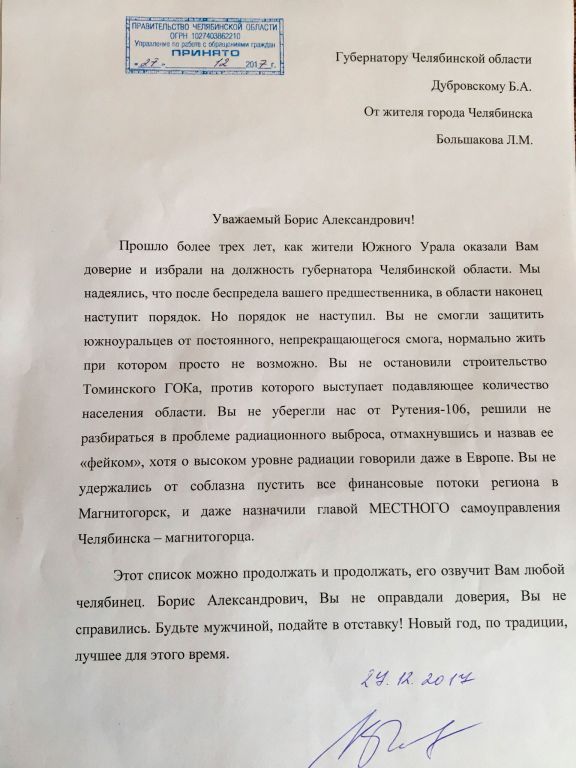 Губернатору Челябинской области Борису Дубровскому предложили уйти в отставку. Соответствующее обращение в приемную главы региона передал сегодня известный челябинский общественник Лев Большаков.