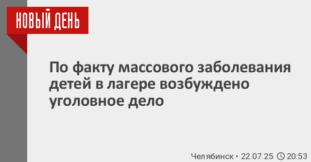 Как сообщили РИА «Новый День» в СУ СКР по Челябинской области, в связи с жалобами на плохое самочувствие в период с 21 по 22 июля 2025 года у нескольких детей возрастом от 7 до 16 лет выявлены признаки острой кишечной инфекции. Состояние здоровья несовершеннолетних удовлетворительное, заболевшим оказывается медицинская помощь, деятельность лагеря временно приостановлена.