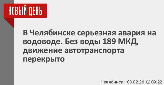 Как сообщили РИА «Новый День» в пресс-службе Госавтоинспекции Челябинска, авария на водоводе произошла сегодня, 3 февраля, у дома №84 по улице Новороссийской. Вода хлынула на проезжую часть.