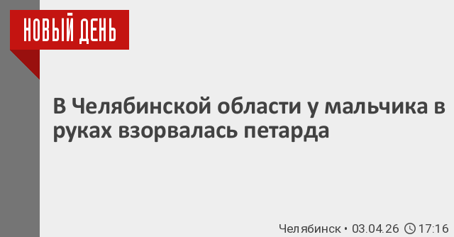Как сообщили в ГУВД Челябинской области, предварительно установлено, что мальчик получил телесные повреждения от найденной петарды, в настоящее время ребенок госпитализирован.
