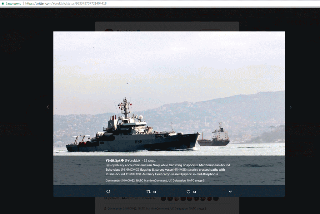 Как передает корреспондент РИА «Новый День», конфуз приключился на этой неделе в в центральной части пролива Босфор. Британский HMS Enterprise принимал участие в учениях в Черном море с целью «усиления способности НАТО защищать национальный суверенитет посредством коллективной обороны», а российский «Кызыл-60» возвращалось из Средиземного моря в Чёрное.