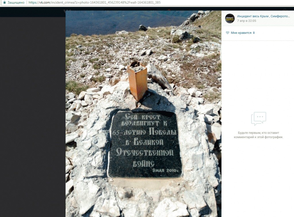 «На вершине горы Чатыр-Даг спилили болгаркой православный крест. Это ужас в мирное-то время»,– написал автор снимков в группе «Инцидент весь Крым, Симферополь и Севастполь»