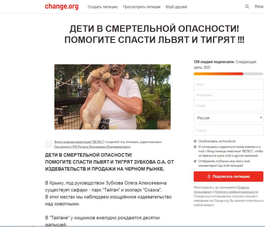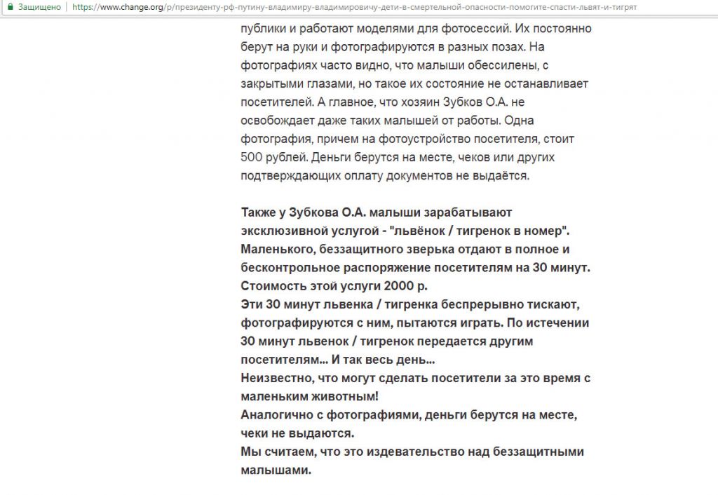 «После того, как малыши подрастают и уже не могут зарабатывать контактами с посетителями, происходит продажа большинства из них на чёрном рынке, – продолжают авторы петиции. – Иначе, при рождении не одного десятка хищников в год, население «Тайгана» составляло бы уже не одну сотню львов и тигров.