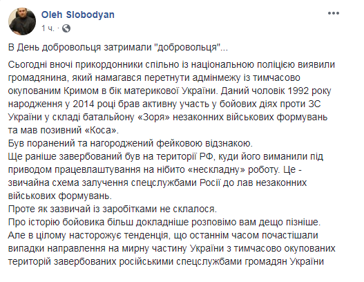 «Сегодня ночью пограничники совместно с Национальной полицией выявили гражданина, который пытался пересечь админграницу с временно оккупированным Крымом за пределами КПВВ в сторону материковой Украины. Этот мужчина, 1992 года рождения, в 2014 году принимал активное участие в боевых действиях против ВС Украины в составе батальона «Заря» незаконных военных формирований и имел позывной «Коса». Был ранен и награжден фейковым знаком отличия» – пишет спикер украинской госпогранслужбы.