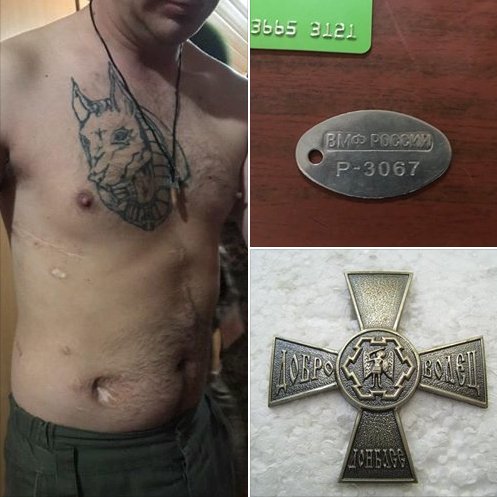 Вместе с сообщением Слободян опубликовал фотографию человека с признаками различных ранений, а также снимки жетона якобы ВМФ России и знака «Доброволец Донбасс».