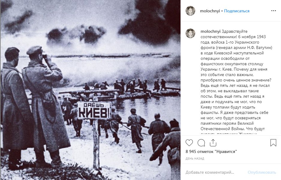 Молочный поздравил подписчиков с Днём освобождения Киева от немецко-фашистских захватчиков, обвинил киевский режим в разжигании гражданской войны в Донбассе и выразил надежду, что украинская столица вновь будет освобождена от «нелюдей» и «нечисти», как 76 лет назад.