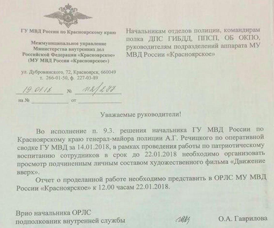 Руководитель международной правозащитной организации «Агора» Павел Чиков опубликовал в своём телеграм-канале приказ начальника ГУ МВД РФ по Красноярскому краю генерал-майора полиции Александра Речицкого, в котором говорится, что полицейские должны сходить на просмотр кинофильма «Движение вверх» «в рамках проведения работы по патриотическому воспитанию».