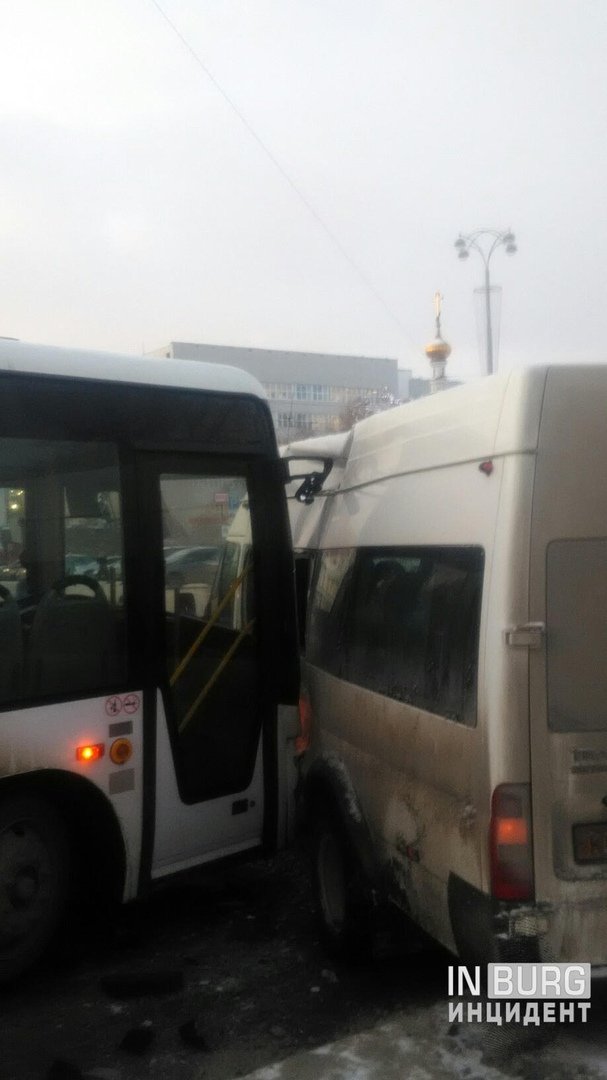 Между двумя автобусами зажало маршрутку, которую развернуло поперек проезжей части.