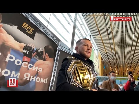 Боец клуба «Архангел Михаил» и временный чемпион UFC в легчайшем весе Петр Ян прилетел в Екатеринбург. В аэропорту его встречали одноклубники, фанаты и друзья – в терминале собрались больше 300 человек. К ним Петр вышел уже подготовленным – с поясом на плече. «Знал, что будут встречать – информация просочилась, разведка работает», – пошутил боец.
