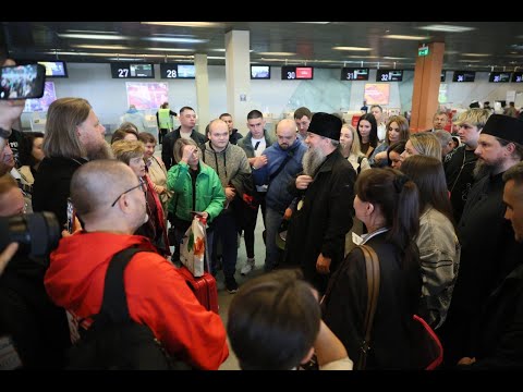 Уральская делегация вылетает из Кольцово за Благодатным огнем. Паломников благословил на дорогу митрополит Екатеринбургский и Верхотурский Евгений.