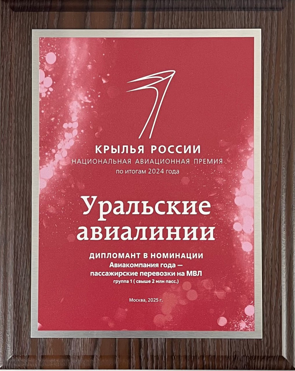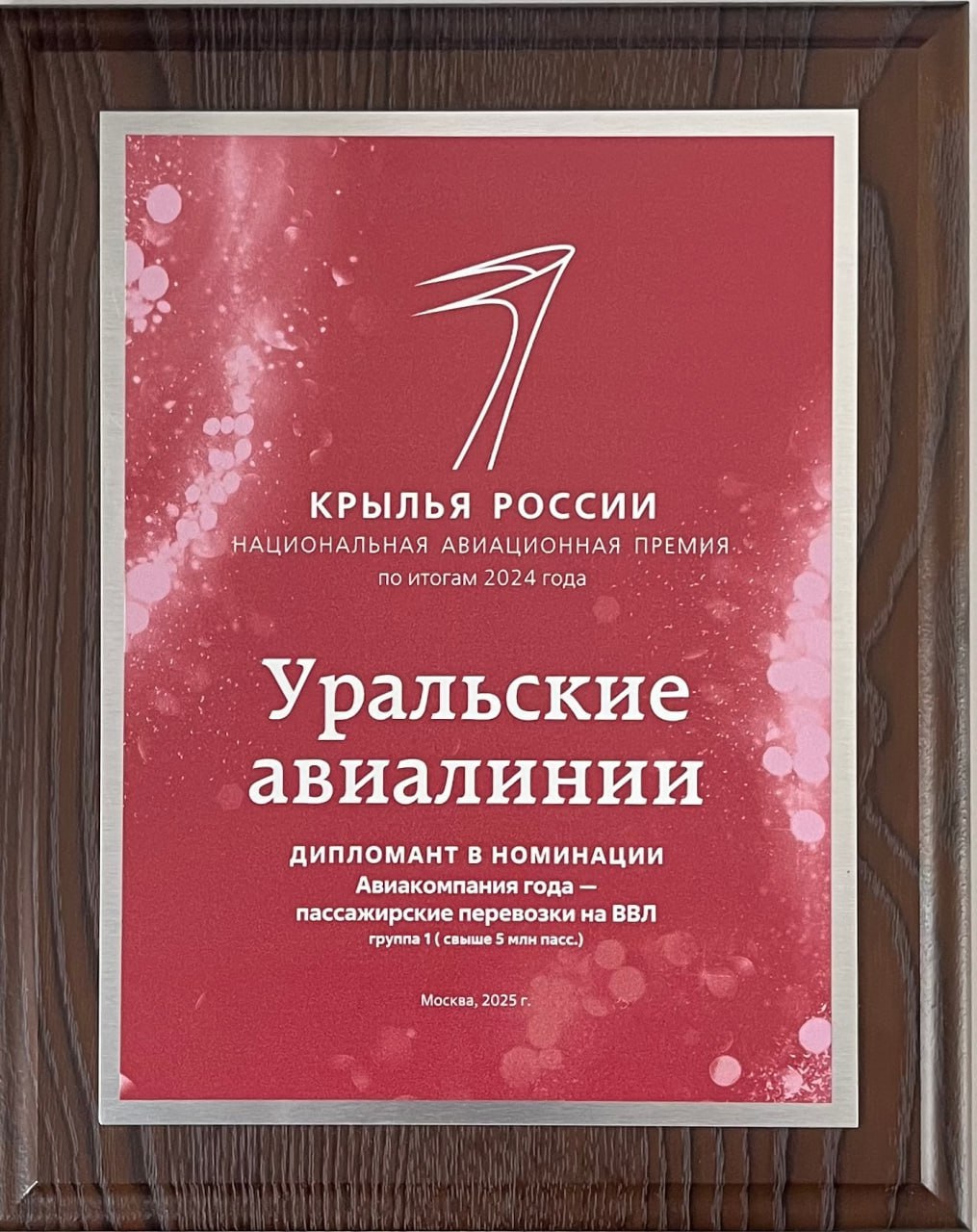 Авиакомпания «Уральские авиалинии» была отмечена дипломами сразу в двух номинациях в рамках награждения национальной отраслевой премии «Крылья России».