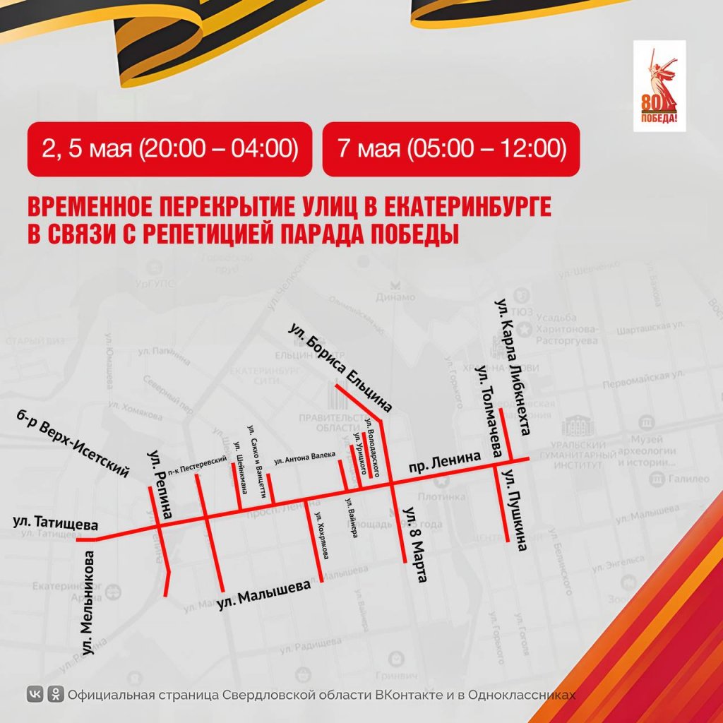 На нескольких центральных улицах Екатеринбурге будет полностью ограничено движение транспорта 2 и 5 мая с 20:00 до 4:00. Перекрытия связаны с подготовкой к празднованию 80-летия Победы в Великой Отечественной войне. Генеральная репетиция парада состоится 7 мая, улицы будут перекрыты с 5:00 до 12:00.