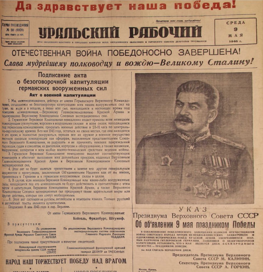 * здесь и далее – материалы из газеты «Уральский рабочий» за 9 мая 1945 года из собрания библиотеки ГАСО