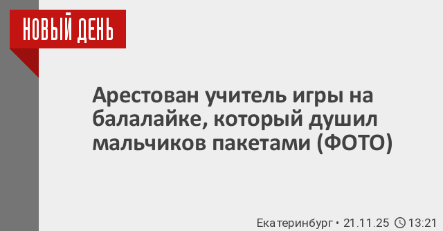 В Екатеринбурге арестован 33-летний учитель музыки Артем Ваганов, которого обвиняют покушении на убийство нескольких подростков. Как сообщили в пресс-службе прокуратуры, по версии следствия, преподаватель кружка по игре на балалайке надевал мальчикам пакет на голову удерживал его, пока они не начинали задыхаться. Ленинский районный суд Екатеринбурга отправил Ваганова в СИЗО до 19 января 2026 года.