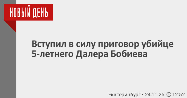 Сегодня Второй апелляционный суд общей юрисдикции рассмотрел апелляции на приговор убийце 5-летнего Далера Бобиева Веронике Наумовой и ее сообщнику Даниилу Егольникову. Как сообщили в пресс-службе облсуда, приговор был оставлен без изменения, апелляционные жалобы – без удовлетворения. Приговор Свердловского областного суда вступил в законную силу.