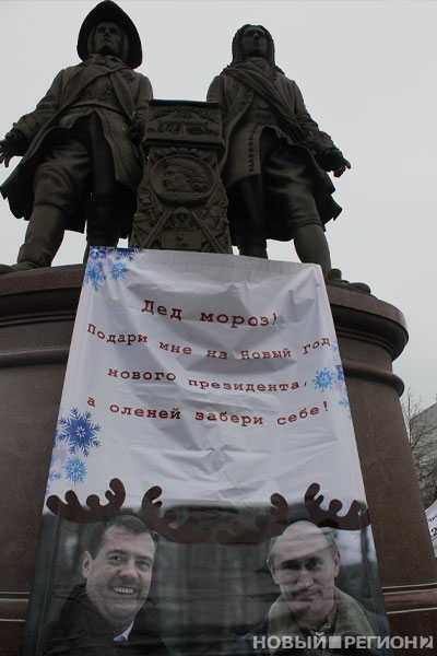 Организаторы акции заранее просили участников приходить с плакатами, поэтому во время самого митинга провели небольшой символический конкурс среди всех транспарантов. Явным победителем – под общий смех, одобрительные крики и аплодисменты – стал, пожалуй, самый большой плакат с фотографиями Путина и Медведева, к головам которых были пририсованы оленьи рога. Подпись к плакату – популярная в Интернете шутка: «Дед Мороз! Подари мне на Новый год нового президента, а оленей забери себе!».