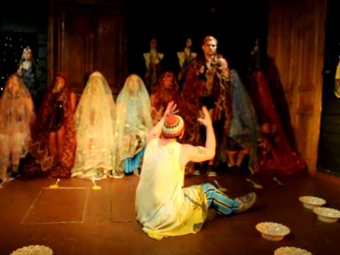 «Слуга двух господ» у Николая Коляды сочетает в себе сразу несколько видов искусств: это и живопись, и пение, и танцы, и кулинария, и даже немного цирк. Одной из режиссерских находок стали репродукции картин художников прошлых веков с прорезями для лиц актеров, из-за чего Труффальдино периодически превращается в обнаженную женщину или Купидона, а Панталоне (Александр Замураев) в говорящую обезьяну. Венецианские музыкальные мотивы меняются вдруг на русские, потому что «Хватит, надоело, давай что-нибудь наше!», а то и вообще артисты начинают танцевать под «Зурбаган». Актеры, как и на репетициях, балуются, им все дозволено: перемазаться в арбузах, походить на головах или одеться в костюм Человека-паука. И из всего этого абсурда, который на первый взгляд вообще не может иметь отношения к пьесе Гольдони, рождается по-настоящему смешной и сильный спектакль.