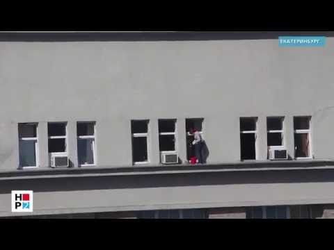 В администрации Екатеринбурга освоили необычный способ мойки окон. Выяснилось, что за чистотой стекол городской ратуши следят то ли «люди-пауки», то ли отважные уборщицы. Во всяком случае, они смело ходят по карнизу четвертого этажа, даже не заботясь о страховке, передает корреспондент «Нового Региона».