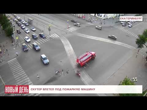 Камера, установленная на перекрестке проспекта Ленина и улицы Карла Либкнехта в Екатеринбурге, вечером 29 июня зафиксировала момент столкновения скутера, ехавшего на зеленый свет, и пожарной спецмашины, спешившей на вызов.