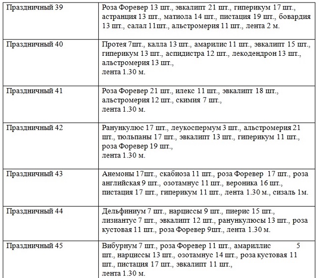 В техзадании также указаны букеты, в которые должны быть оформлены цветы. Вариантов букетов 51 – это протокольный, настольный и несколько десятков вариантов вида «праздничный». Отмечено, что «поставщик должен выполнять заявки заказчика круглосуточно, в том числе в выходные и праздничные дни», поставка осуществляется до 31 декабря этого года.
