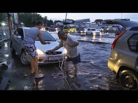 Корреспондент NDNews.ru снял на видео мучения автолюбителей в самый разгар ливня.