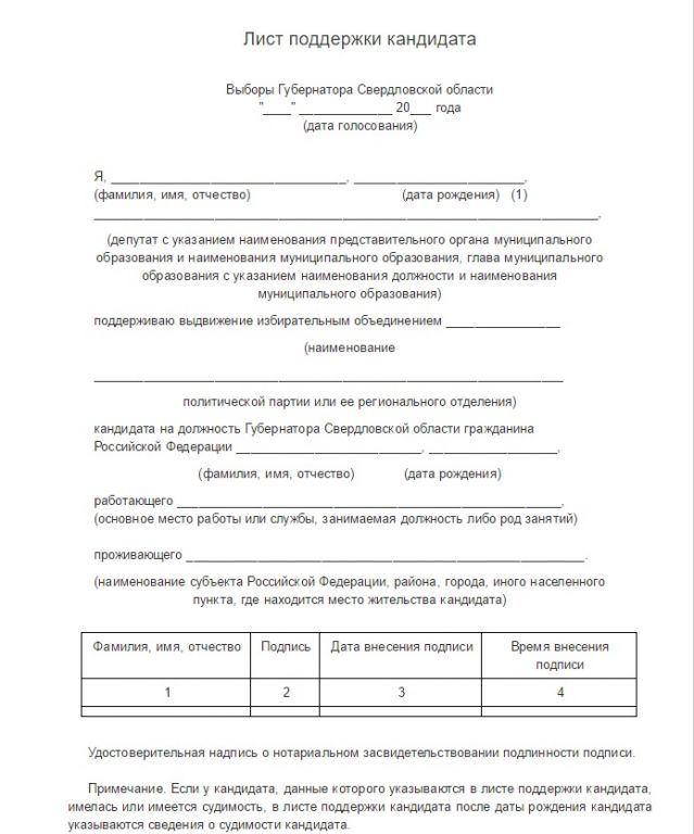 Каждый муниципальный депутат ставит свою подпись собственноручно на отдельном листе, с указанием не только даты, но и точного времени. На листе должны быть обязательно указаны: ФИО кандидата в губернаторы, дата его рождения, место работы, выдвинувшая его партия, сведения о судимости (если она есть). Отметим, что в предлагаемой форме подписного листа свободного места под сведения о судимости нет, что может создать неудобства, в частности, возможному кандидату Евгению Ройзману.