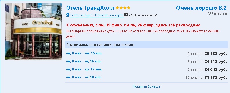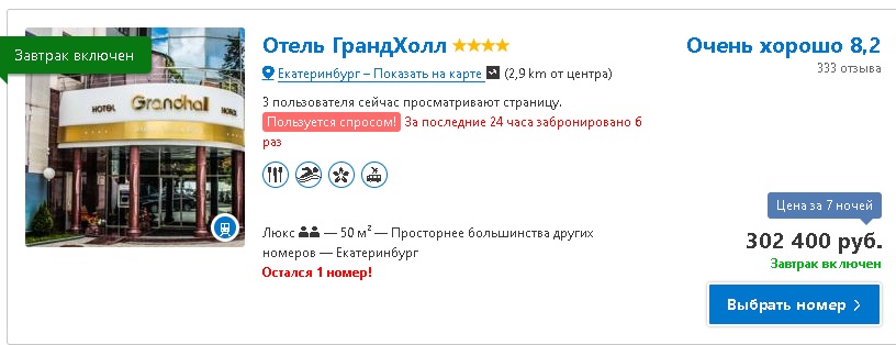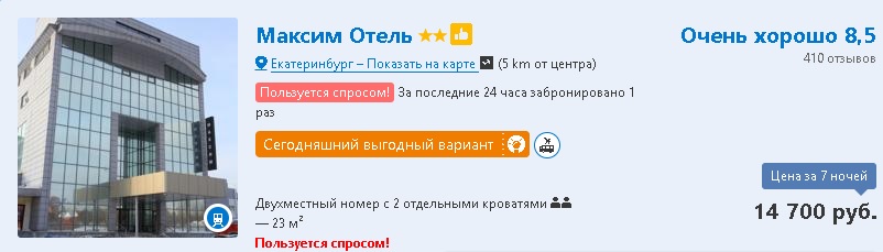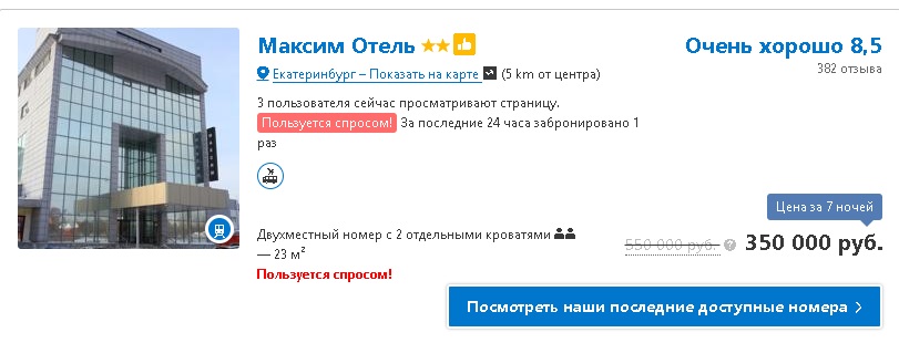 РИА «Новый День» не нашел на Booking.com номера за миллион рублей, но то, что отельеры решили заработать на ЧМ, уже заметно. Так, некоторые отели подняли стоимость номеров на июнь-июль 2018 года в 10 раз. Например, отель «Гранд Холл» 4*. Если бронировать номер на февраль 2018 года, то за неделю вы отдадите 25-35 тысяч рублей. Но тот же номер в июне-июле будет стоить свыше 300 тысяч. «Отель Максим» решил заработать еще больше: сегодня номер стоит около 15 тысяч рублей за неделю, а летом 2018 – уже 350 тысяч рублей.
