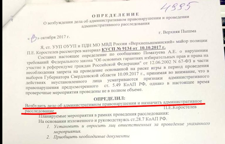 Как передает корреспондент РИА «Новый День», в подтверждение своих слов он опубликовал документ, в соответствии с которым процессуальное решение было принято 13 октября в Верхней Пышме. Дело по заявлению юриста ФБК Александра Помазуева возбудил майор Павел Коростелев по статье 5.49 КоАП РФ «Нарушение запрета на проведение в период избирательной кампании, кампании референдума лотерей и других основанных на риске игр, связанных с выборами и референдумом». Санкция статьи предусматривает для юридических лиц штраф до 50 тысяч рублей.