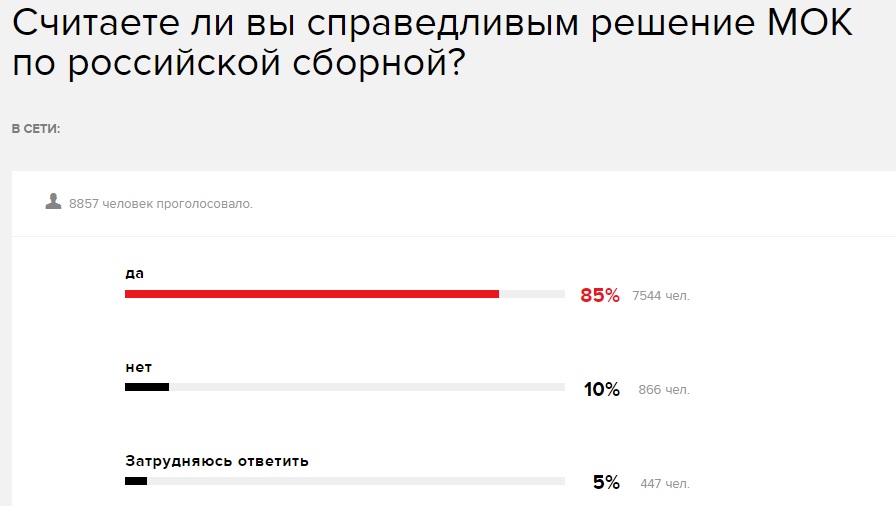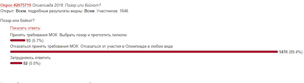 О том, что по крайней мере часть населения «психологически готова», говорят результаты голосования на странице популярного в патриотических кругах блогера Бориса Рожина (colonelcassаd). Более 89% его читателей считают, что Россия должна полностью бойкотировать Олимпиаду-2018. «Включать режим извинений и покаяний в этих условиях (принимая требования МОК, Россия распишется перед всем миром, что два года спортивные чиновники обманывали как мир, так и собственное население), это куда как большая проблема, нежели последствия бойкота, которые также далеко не радостные для отечественного спорта», – написал Борис Рожин, отражая одну из полярных точек зрения.