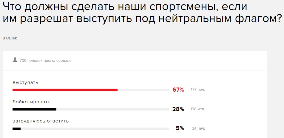 Прямо противоположный настрой наблюдается среди слушателей радиостанции «Эхо Москвы» 67% которых считает, что российские спортсмены должны принять предложение выступить под нейтральным флагом. Еще 28% считает, что Олимпиаду надо бойкотировать, 5% затрудняются ответить.