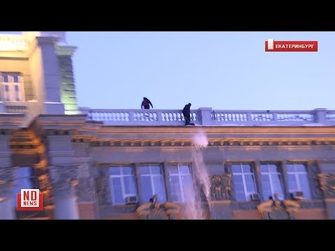 Жители Екатеринбурга сегодня могли наблюдать удивительный пример бесстрашия сотрудников коммунальных служб. Два работника в вечернее время счищали снег с крыши администрации города без какой-либо страховки. Первый орудовал лопатой за бордюром, второй понаблюдав за процессом несколько минут, решил все-таки сходить за страховкой для коллеги.