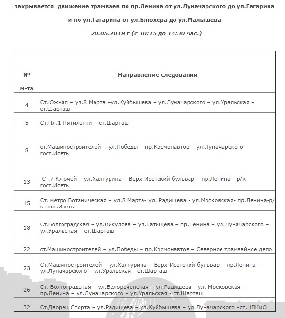А в воскресенье, 20 мая, с 10:15 до 14:30 будет закрыто движение трамваев по проспекту Ленина от улицы Луначарского до улицы Гагарина, а также – по Гагарина от Блюхера до Малышева. Ограничения вводятся из-за проведения полумарафона «Забег». В это время направление следования изменят трамваи № 4, 5, 8, 13, 15, 18, 22, 23, 26, и 32.