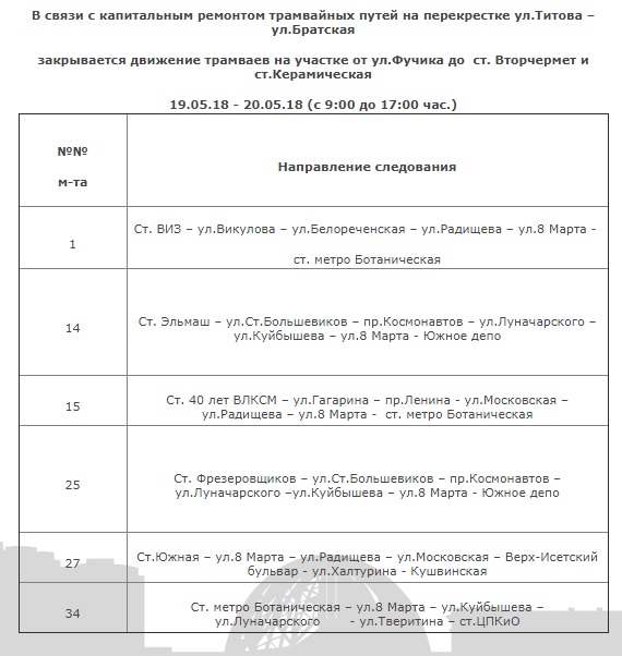 Как сообщает ЕМУП ТТУ, на Вторчермете трамваи не будут ходить 19 и 20 мая с 9 до 17 часов. Из-за капитального ремонта путей на перекрестке Титова – Братская трамваи не смогут проехать от улицы Фучика до станций «Вторчермет» и «Керамика». Трамваи № 1, 14, 15, 25, 27 и 34 пойдут до Южного депо и станции метро «Ботаническая».