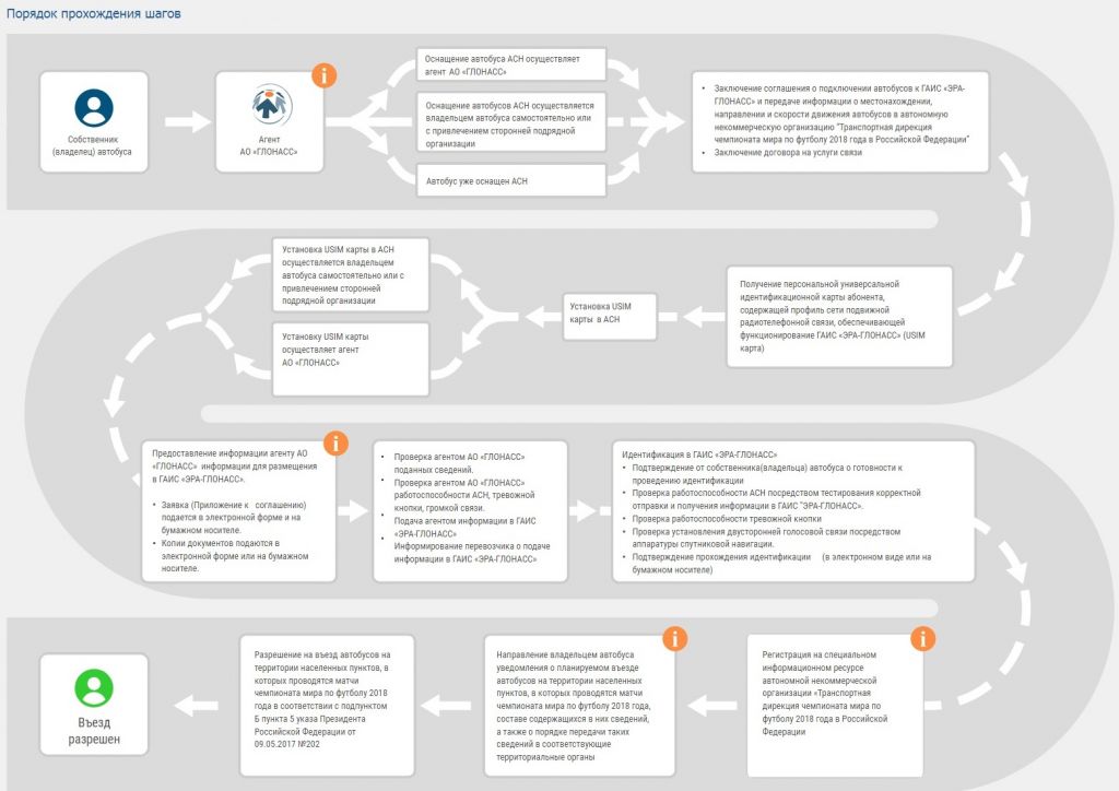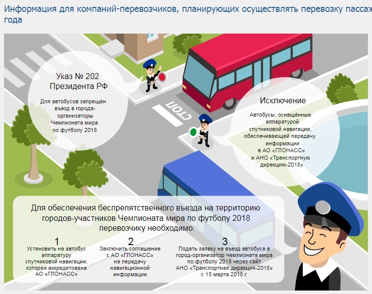 2) Автобусам, оснащенным навигацией ЭРА-ГЛОНАСС. Проще говоря, те автобусы, которые оснащены навигаторами ГЛОНАСС, могут заезжать в города проведения ЧМ. Но есть одна оговорка: владельцы автобусов должны быть зарегистрированы на портале «Транспортная дирекция ЧМ по футболу – 2018» и заранее уведомлять через сайт о передвижениях. Причем уведомление о въезде в город и маршруте должно поступить через сайт дирекции не позднее, чем за 48 часов. Внести изменения в маршрут можно не позднее, чем за 3 часа до въезда. Вся информация передается в территориальные органы МВД.