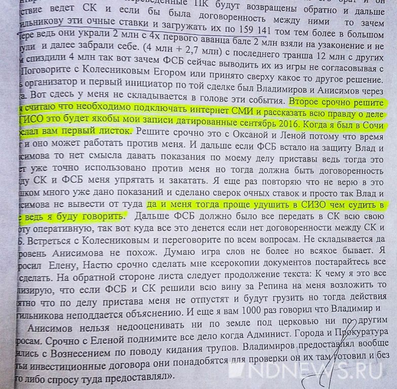 «Срочно решите [вопрос] я считаю что необходимо подключать интернет СМИ и рассказать всю правду о деле МУГИСО это будет якобы мои записи датированные сентябрь 2016. Когда я был в Сочи прислал вам первый листок... Решите это срочно с Оксаной [Чернавской] и Леной [Луниной]… Меня проще удушить в СИЗО ведь я буду говорить», – говорится в письме Сиволапа (здесь и далее орфография и пунктуация автора сохранены).