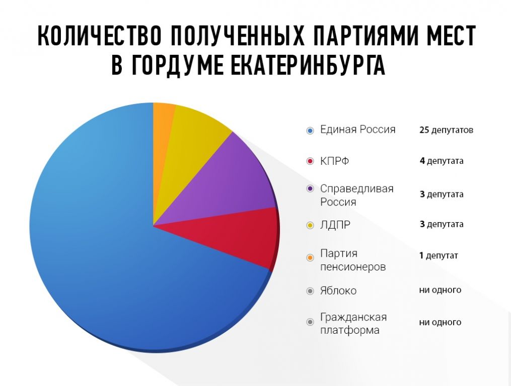 По мнению автора проекта «Муниципальные выборы в Екатеринбурге 2018», «Единая Россия» получит от 24 до 26 мандатов, КПРФ – четыре мандата, ЛДПР – три мандата, «Справедливая Россия» – от двух до четырех мандатов, Партия пенсионеров – один мандат. «Яблоко» и «Гражданская платформа» не смогут пробиться вообще.