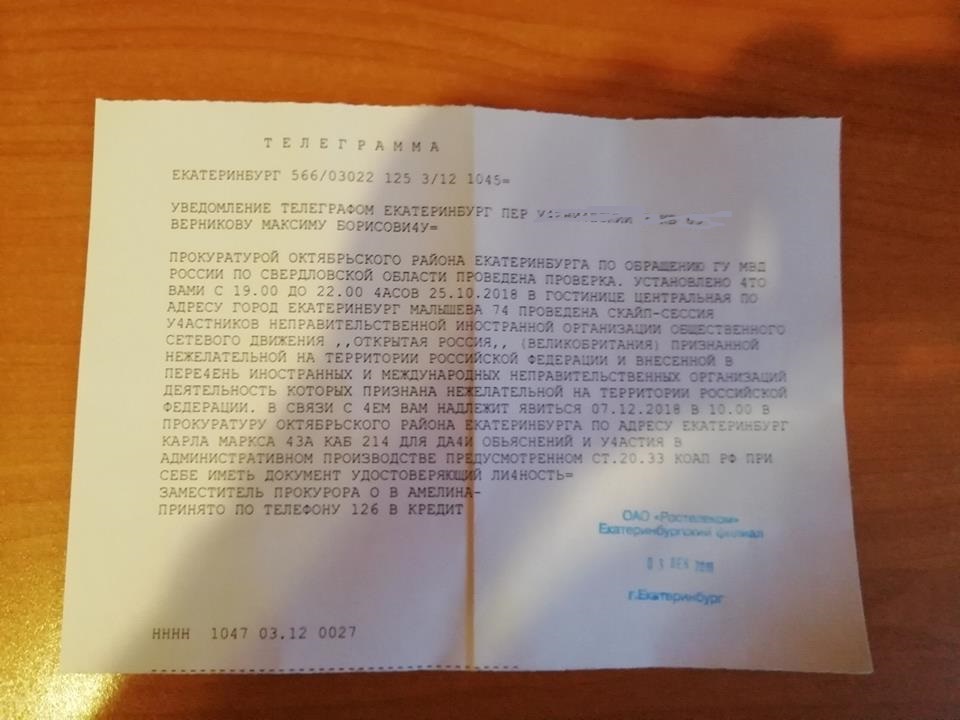 В Екатеринбурге прокуратура возбудила дело против оппозиционера Максима Верникова. Поводом стала прошедшая полтора месяца назад беседа по скайпу с Михаилом Ходорковским.