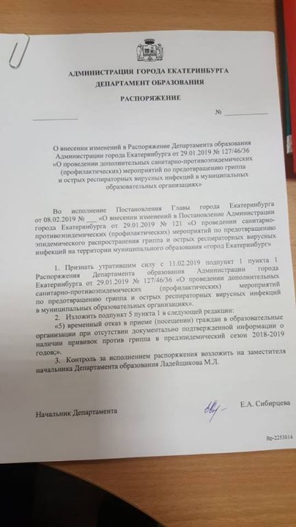 Начальник департамента образования Екатеринбурга Екатерина Сибирцева подписала распоряжение, согласно которому с 11 февраля отменяется предыдущее распоряжение о приостановке обучения в школах из-за ОРВИ и гриппа. Однако временный запрет принимать в школы детей без прививок от гриппа сохраняется.
