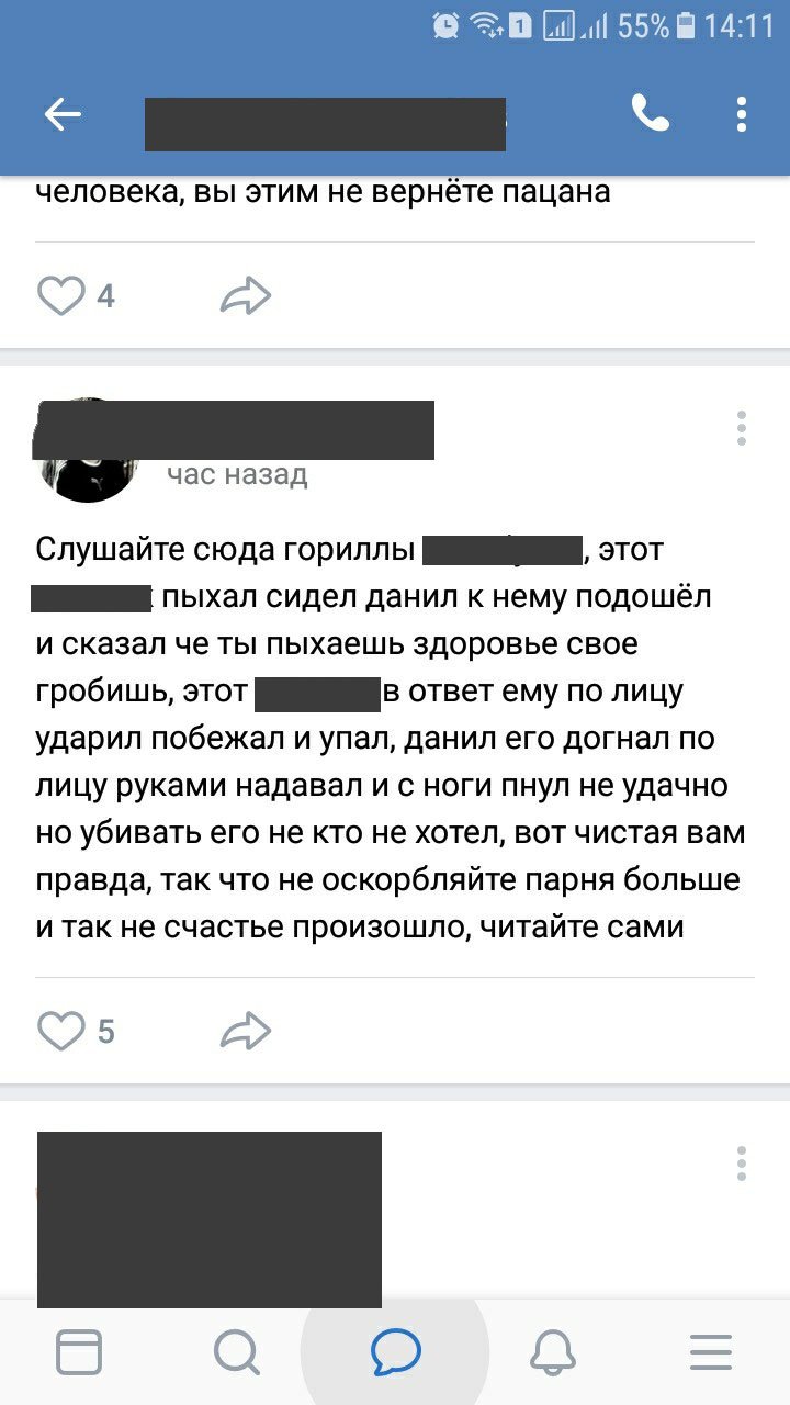 Как ранее сообщал «Новый День», сообщество «Инцидент Первоуральск» опубликовало пост, в котором говорилось: «Около Мечети группа наркоманов убили парня». Пользователи социальной сети нашли страницу «ВКонтакте» 24-летнего Данила Ч., который якобы является одним из нападавших. Неравнодушные тут же устроили настоящую травлю мужчины в социальной сети. В защиту выступают знакомые Данила. «Данил подошел к нему и сказал «чего ты [токсикоманишь]», подросток в ответ ему по лицу ударил, побежал и упал. Данил догнал его, по лицу руками надавал и с ноги пнул неудачно, но убивать его никто не хотел», – пишет на стене Данила один из пользователей.