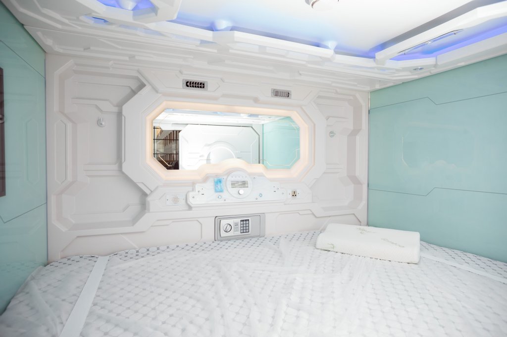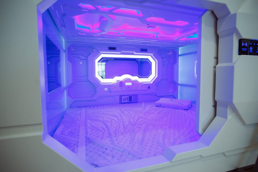 Как сообщили «Новому Дню» в пресс-службе воздушной гавани, капсулы расположены на втором этаже в международном терминале, в общей зоне (т.е. до прохождения контроля), рядом с недавно открывшейся детской игровой площадкой. Каждая капсула – а всего их 14 – представляет собой ячейку 2 на 1,6 метра с двуспальной кроватью и подушками. Внутри есть система вентиляции, телевизор, сейф, розетки, зеркало с подсветкой.