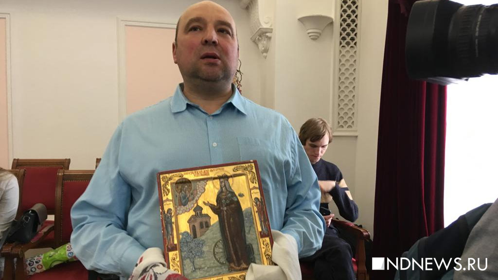 09:55 Это икона святой Екатерины. Мужчина говорит, прихожане попросили принести – по их мнению, она должна помочь на сегодняшнем мероприятии.