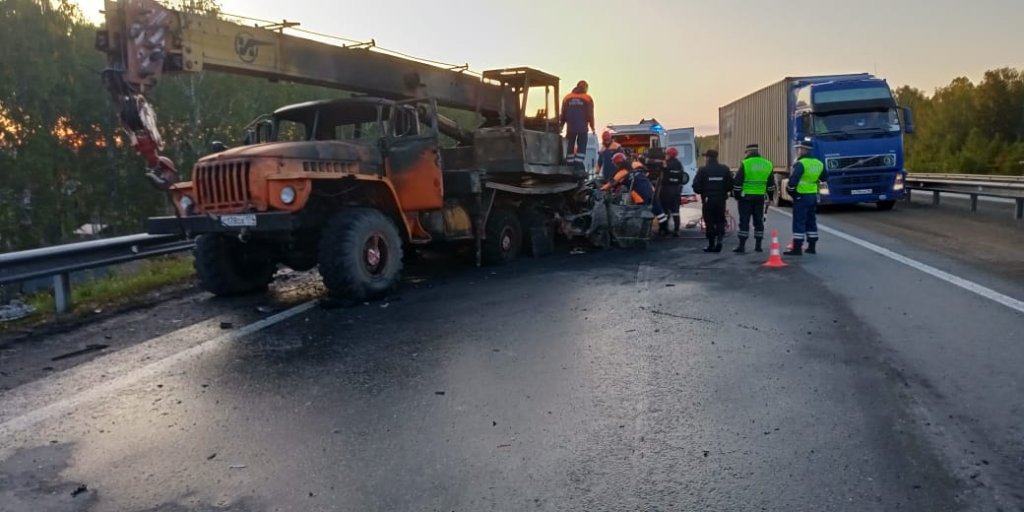 Ночью на 25-м километре трассы Екатеринбург – Тюмень случилось ДТП, в котором погибли два человека и еще один получил травмы. 43-летний водитель ГАЗ-2705, который ехал со стороны Тюмени, врезался в стоящий автокран «Урал-555». После обе машины загорелись. Прибывшие на место аварии сотрудники МЧС России потушили огонь.