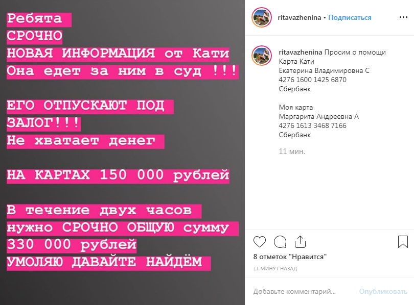 Как пишет сегодня в своем Instagram* подруга семьи пострадавшего Маргарита Важенина, которая тоже находится с мужем в Таиланде, по последним данным, Вадима готовы выпустить под залог. Но у россиян не хватает денег – за ближайшие несколько часов им надо собрать 330 тысяч рублей.